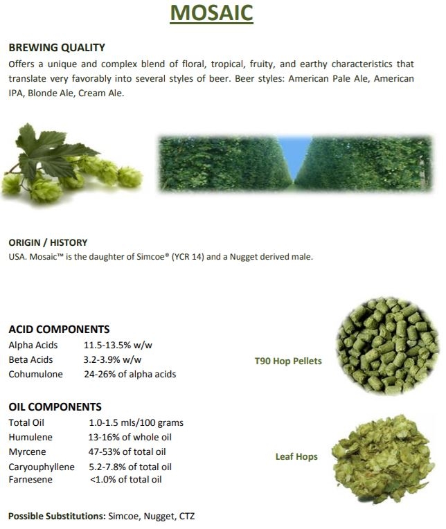 Mosaic 13% US 500gr Mosaic er en helt unik og kompleks humle som tilfører ølet en kraftig tropisk og fruktig karakter til ølet. Vanlige ølstiler er IPA, American Pale Ale, Blonde Ale og Cream ale PrisNOK445,00 inkl. mva. Utsolgt Ønskeliste Del dette Produktinfo Produktanmeldelser (0) Aroma: Tropisk frukt, sitrus, urter og furunål Type: PelletsBruk: Aroma / BitterÅr: 2020 Land: USA Typiske verdier: (Nåværende alfa-syre er på etiketten): 11,5 - 13,5%Tilsvarende humlesorter: Simcoe, Nugget, CTZ Skriv en produktanmeldelse og del dine erfaringer med dette produktet med andre kunder. Email Navn Din vurdering? 1 star 2 star 3 star 4 star 5 star 6 star Oppgi en tittel for anmeldelsen din Skriv inn produktanmeldelsen i feltet under